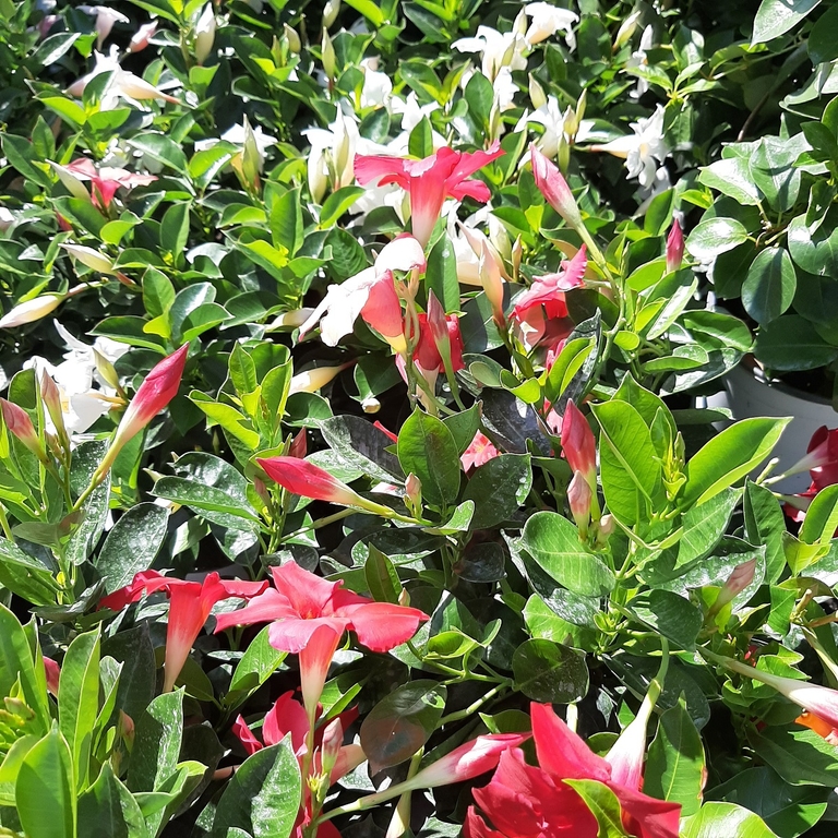 Le dipladenia (mandevilla spp.) ou jasmin du brésil est une plante grimpante volubile à tiges ligneuses portant des feuilles persistantes coriaces et lustrées et des fleurs en entonnoir colorées.