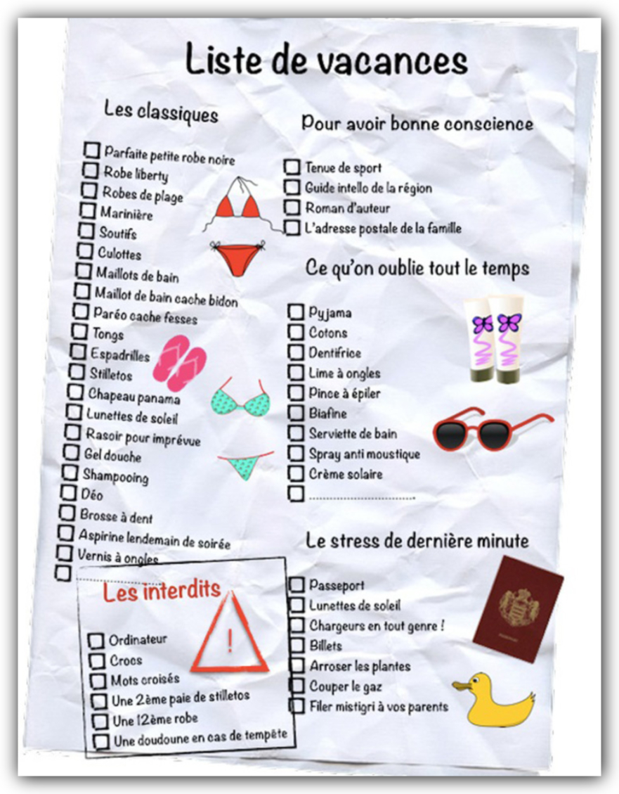 Trending Liste Vacances Pics Liste complète de toutes les choses à ne pas oublier et tout le nécessaire pour bien préparer vos vacances au soleil et à la mer. · les documents à ne pas oublier · le contenu de vos valises · les basiques d'une. Notre offre comprend des milliers d'hôtels et vols. Chercher & réserver des vacances. Ces hébergements ont obtenus l'agrément gîtes de france mais n'ont pas encore été visités par la commission de classement. Retrouvez ici la liste de nos.