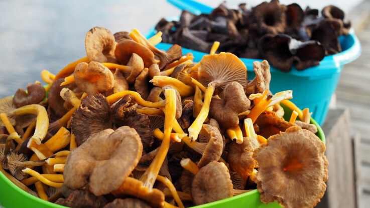 Tourte aux champignons de paris, velouté de bolets, omelettes.
