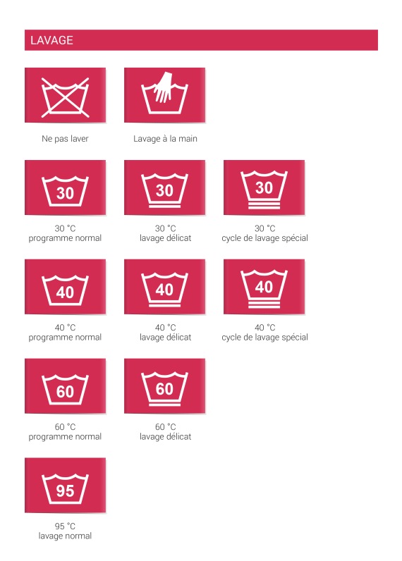 Symbole De Lavage L'étiquetage pour l'entretien des textiles se présente sous forme d'étiquettes, souvent cousues sur les textiles. Lavage à la main, séchage, repassage… Le nombre dans la bassine indique la température maximale de lavage. Le(s) trait(s) sous la bassine indique(nt) le programme d'agitation.